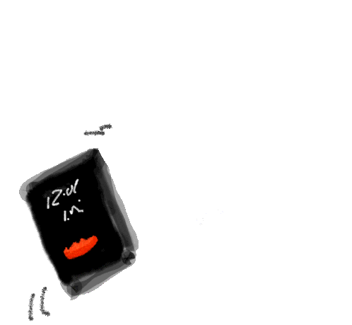 A crudely drawn black mobile phone with a red mouth, displaying changing numbers and text, possibly a "Maikbaber" phone.