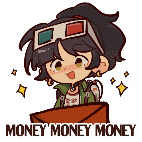 Mekistrophia An An Lee, wearing 3D glasses, excitedly holds an envelope with 'Money Money Money' text.