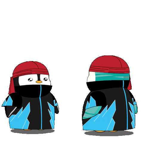 Two cartoon penguins, one pointing at the other in a classic meme pose, resembling the Spider-Man pointing meme.