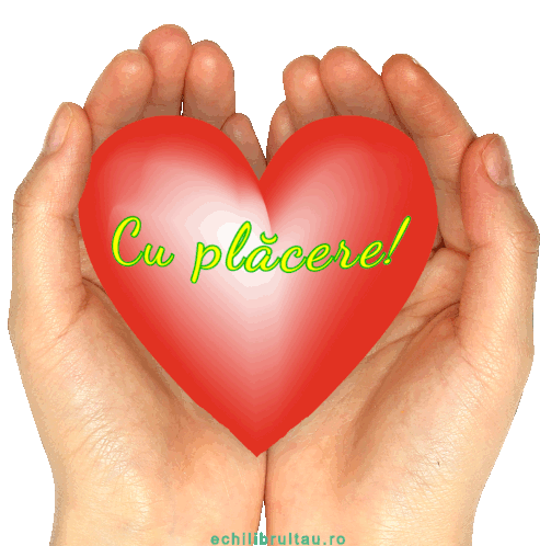 A warm 'Cu plăcere!' (You're welcome!) message displayed in a glowing red heart held gently by cupped hands, perfect for reactions.