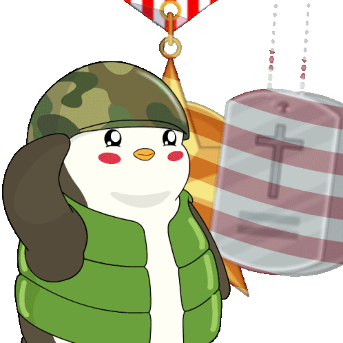 A cute cartoon penguin in military uniform salutes, honoring Memorial Day with a dog tag.