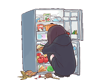 Menhera character crouches, looking for food in an open refrigerator, surrounded by discarded snacks.