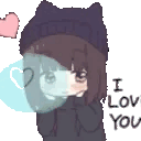 A pixel art girl in a cat hat and hoodie blows a heart bubble with 'I Love You' text, conveying affection.