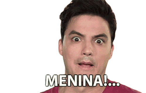 Felipe Neto reacts with wide eyes and an open mouth, exclaiming 'Menina!' in disbelief or surprise.