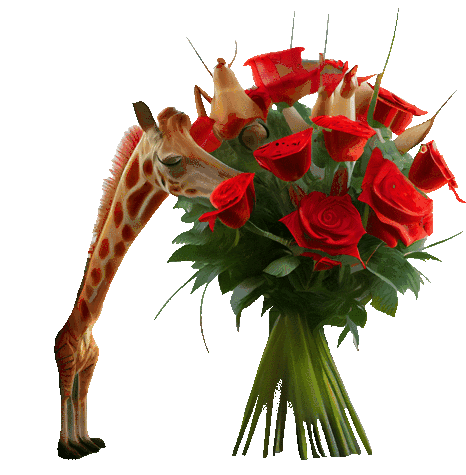 An adorable giraffe bows to a vibrant bouquet of red roses, with the word "Merci" (Thank You) glowing and sparkling.