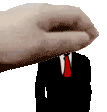 A hand holds a small, stylized Mercury meme man in a suit and tie, a humorous sticker featuring the iconic Pac Man character.