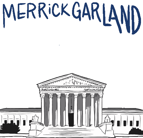Merrick Garland fights for justice for all of us, depicted with the Supreme Court building in a hand-drawn style.