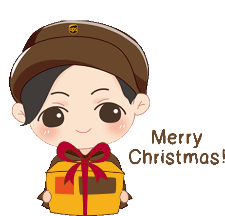A cheerful chibi-style UPS character, wearing a brown uniform and cap, happily holds a festive Christmas gift.