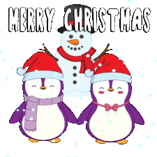A charming animated sticker featuring two cute penguins and a snowman, wishing everyone a Merry Christmas and Happy Holidays.