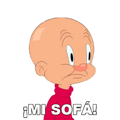 Elmer Fudd looks shocked and exclaims '¡Mi Sofá!' (My Sofa!) in this animated sticker, perfect for expressing surprise.