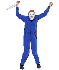 Michael Myers, the iconic horror character, performs a lively pixel art dance, holding his signature knife.