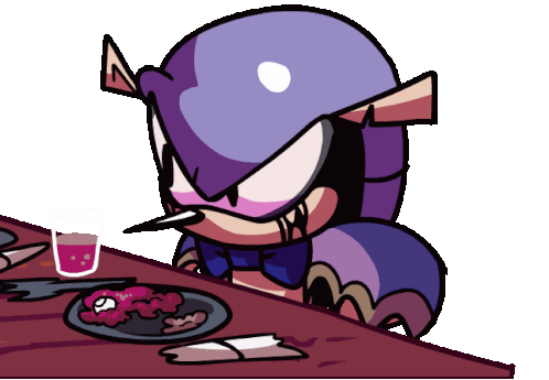 Mighty Zip, a purple armadillo character, sits at a table, eating a red, gooey meal and drinking from a glass.