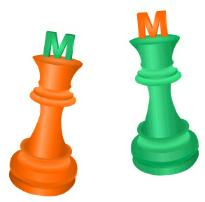 Two Migros Supportyoursport chess queen pieces, one orange with a green 'M', one green with an orange 'M'.