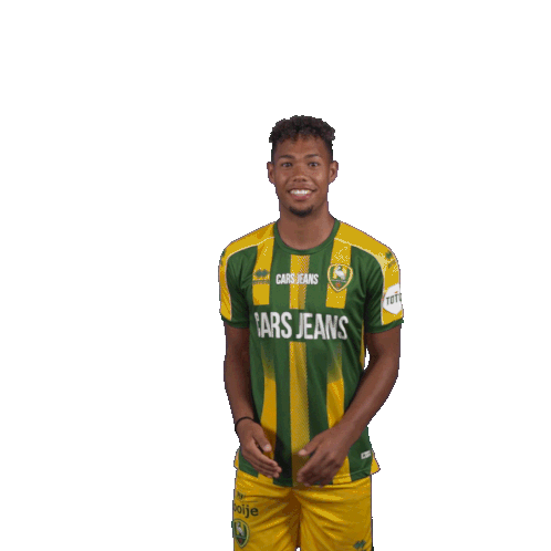 Milan Van Ewijk, the ADO Den Haag player, celebrates with a joyful dance and raised arms, smiling brightly.