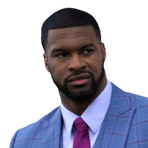 Tony King, from BET's Sistas, looks mildly annoyed and displeased, wearing a sharp blue plaid suit and a purple tie.