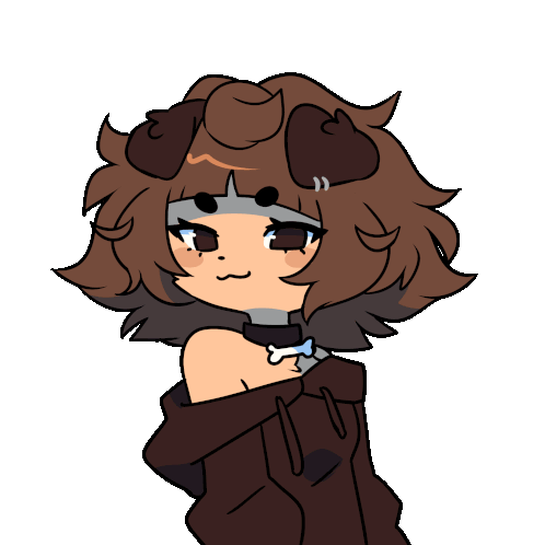 Mimi Typh, an adorable animated dog girl with fluffy brown hair and dog ears, blinks and moves her head, wearing a brown hoodie and a bone-tag collar.