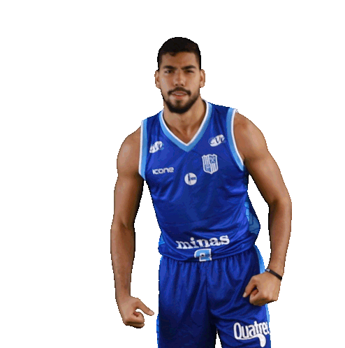 A male basketball player from Minas Tenis Clube flexes his biceps and smiles in celebration.