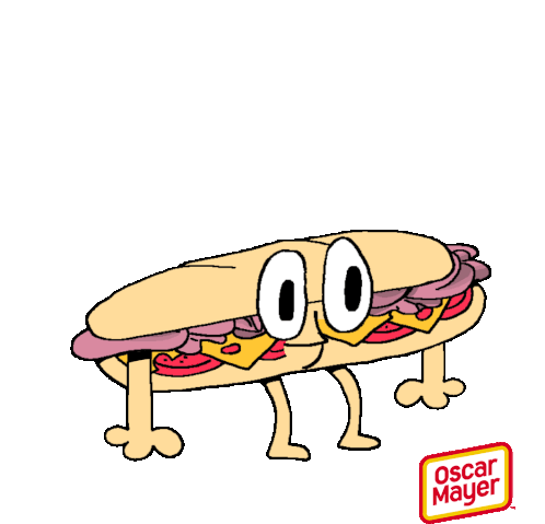 A cartoon Oscar Mayer sub sandwich with big eyes reacts with a 'mind blown' expression as its top bun floats away.