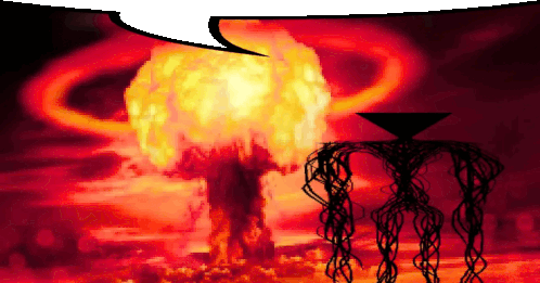 a drawing of a nuclear explosion with a speech bubble