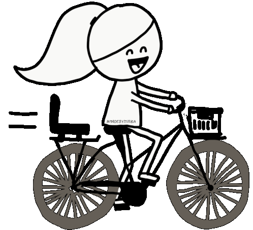 Minka, a happy stick-figure woman, cycles her bike with a basket and child seat, created by Madebyminka.
