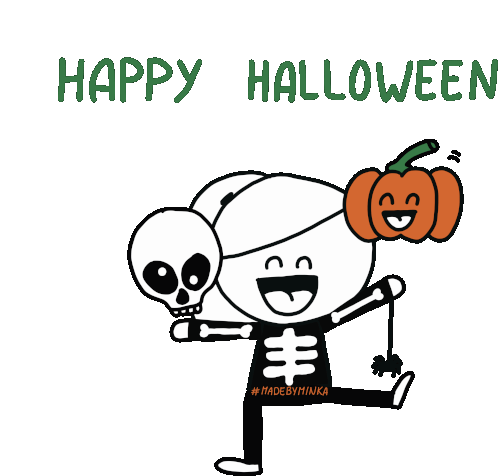 Minka Madebyminka's animated sticker features a dancing skeleton holding a pumpkin and skull, with 'Happy Halloween' text.