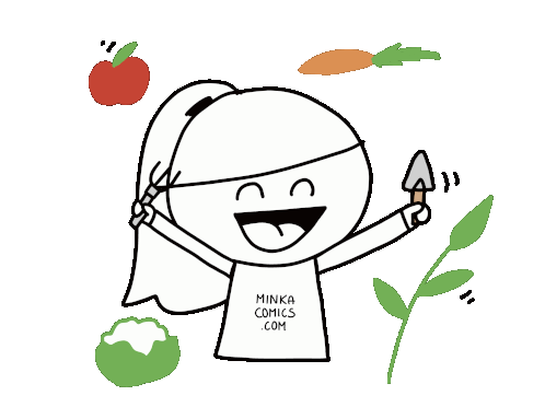 Minka Minkacomics character in a black and white drawing, engaged in gardening activities.