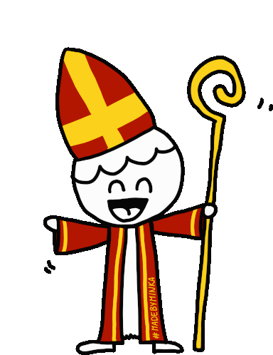 Minka Minkacomics character dancing happily, celebrating Sinterklaas with traditional Dutch elements.