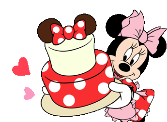 Minnie Mouse happily presents a two-tiered birthday cake, featuring a Minnie head on top and a polka-dotted base.