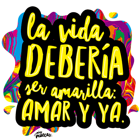 Missmuecas sticker with the Spanish quote 'la vida DEBERÍA ser amarilla: AMAR Y YA.' (life SHOULD be yellow: LOVE AND THAT'S IT).