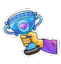 A cartoon hand proudly holds a shimmering blue trophy, adorned with a vibrant pink heart, celebrating a win.