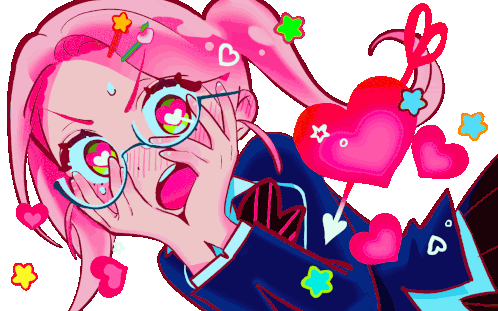 a cartoon drawing of a girl with pink hair and hearts around her