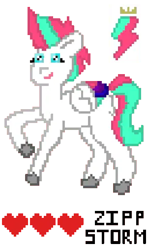 An animated pixel art MLP-style blue pony with a vibrant rainbow mane and tail, adorned with black speckles, subtly moves.