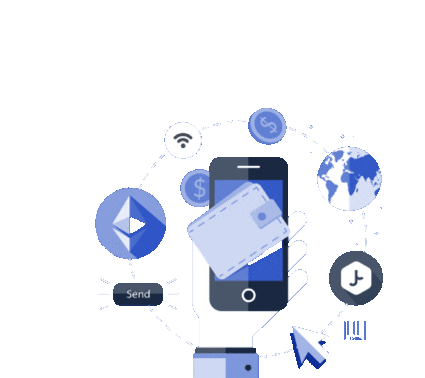 Animated sticker featuring a hand holding a smartphone, surrounded by cryptocurrency symbols, a digital wallet, and global finance icons.