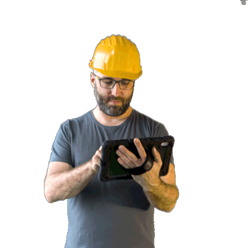 Josef Beneš, a construction worker in a yellow hard hat, diligently uses a tablet for mobile online tasks.