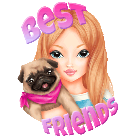 An animated sticker featuring a cute girl winking and holding a happy pug dog, with the text 'BEST FRIENDS' displayed.