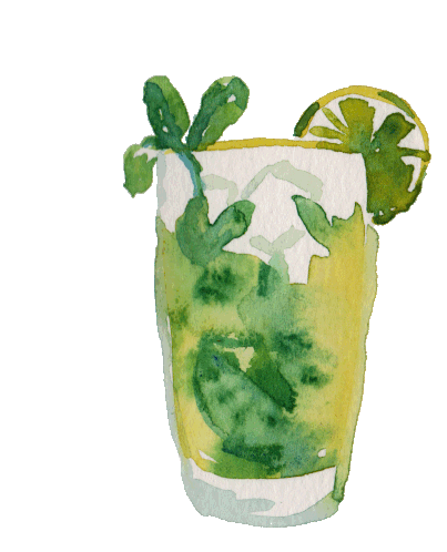 A vibrant watercolor painting of a refreshing mojito drink, garnished with fresh mint leaves and a slice of lime.