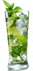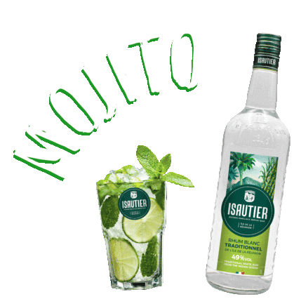 A refreshing mojito cocktail in a glass, complete with lime and mint, stands beside a bottle of Isautier Rhum Blanc Traditionnel.