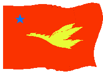A red flag featuring a yellow flying goose and a blue star, representing the Chinese Air Force, waving in the wind.