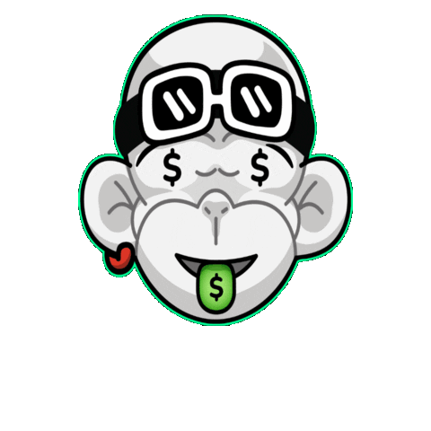 A cool monkey wearing sunglasses with dollar signs on its eyes and a dollar bill in its mouth, symbolizing wealth.