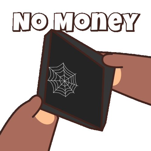 A cute brown bear with a sad expression shows an empty wallet, emphasizing 'NO MONEY' in a humorous way.