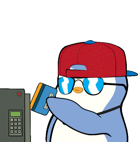 A cool Pudgy Penguin in a cap and sunglasses swipes a credit card into a machine, focused on shopping.