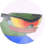 A pixel art MonkaW Peepo frog wearing cool sunglasses and a hat, with a subtle animated glare effect.