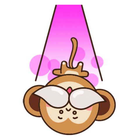 A cute, round brown monkey character hangs upside down, illuminated by a vibrant purple spotlight with floating particles.