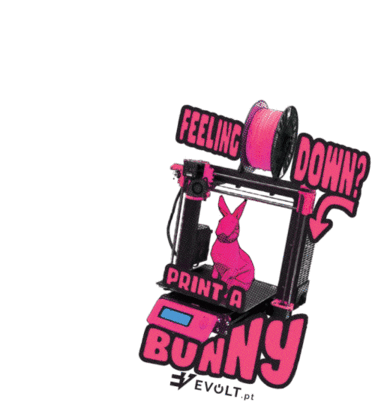 Animated sticker featuring a 3D printer creating a pink bunny, with the text 'Feeling Down? Print a Bunny' and 'EVOLT.pt'.