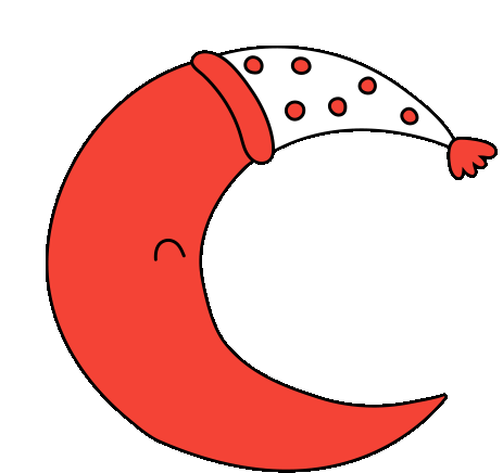 A cute red crescent moon wearing a white sleeping cap with red polka dots, gently smiling and closing its eyes.
