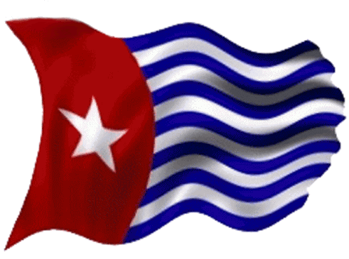 The Morning Star flag of West Papua, featuring its distinctive red triangle, white star, and blue and white stripes, waving.