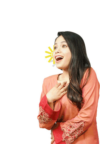 a woman in a pink shirt with embroidered sleeves looks surprised with her mouth open