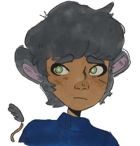 Elodie, the Mouse Kid, smiles brightly in a detailed portrait, featuring green eyes and distinctive mouse ears.