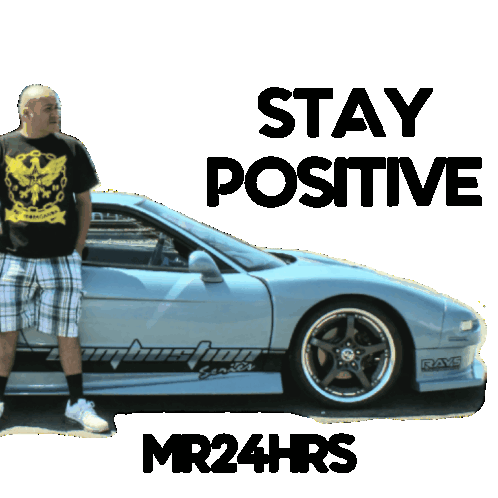 a man standing next to a car that says stay positive on it