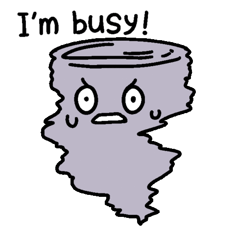 A cartoon tornado character with an angry face and the text 'I'm busy!' above it, representing being overwhelmed with much work.